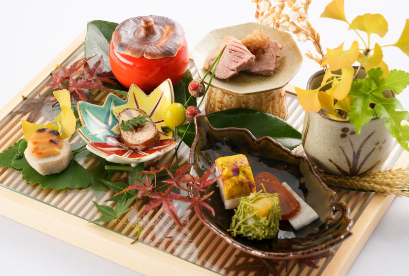 ●献立例 ◎八寸 里芋の柚子味噌田楽 ふくの唐揚げ 檸檬 秋果実の白和え 胡桃 柿なます 黄身酢 秋子椎茸の菊花和え 小袖出汁巻き玉子 なめ茸卸し 南部一郎かぼちゃの擂り流し 抹茶 安納芋の南蛮漬け ◎温物 黒トリュフの茶わん蒸し 男爵芋餡 かしわ シブレット ◎主菜 ~焼物~ 銀かれいの丹波焼き 酢取茗荷 ~温物~ 秋鮭の薯蕷蒸し 茸餡 ~炊き合わせ~ 翡翠茄子 牛蒡 人参 ~揚物~ 安比舞茸の天婦羅 獅子唐 山椒塩 ~強肴~ 若鶏の木の実焼き 香味野菜 ◎食事 ~いわて純情プレミアムひとめぼれ使用~ 海鮮三味御飯 鮪・甘海老・自家製イクラ・宿毛湾直送鮮魚 香の物 赤出汁合わせ味噌仕立て ◎甘味 讃岐和三盆プリン |