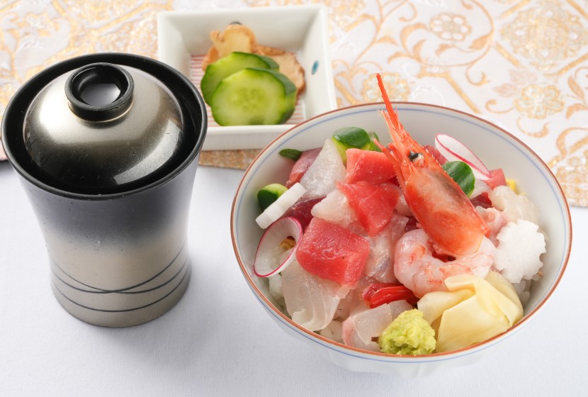 締めにはいわて純情プレミアムひとめぼれ使用の海鮮御飯と赤出汁。