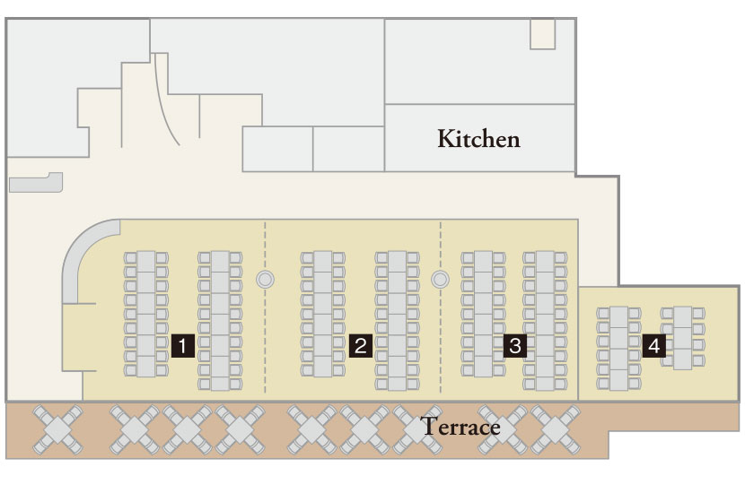 テラス付きのダイニングは120名収容の広々とした空間。